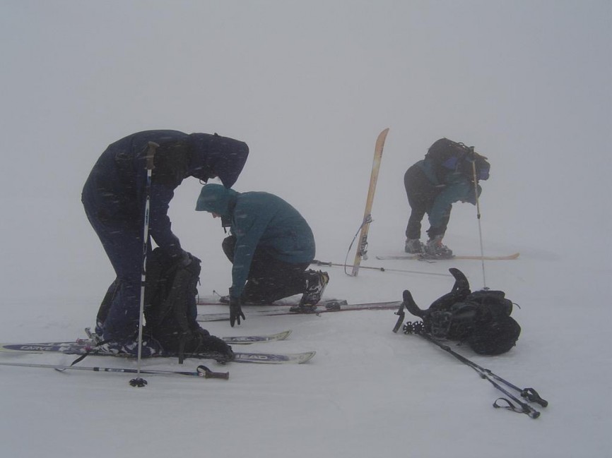 Druhý den jsme vstávali do sněžení, nalehko bez těžkých batohů jsme vystoupali na Kriváň (1708m.n.m.), kde bylo prd vidět a prvních pár desítek výškových metrů jsme jeli skoro poslepu. Spodní část sjezdu byla v nádherném sněhu parádní. Vystoupali jsme zpět do Snilovského sedla (1524m.n.m.) a sjížděli směr chata Vrátná. Cestou po rozjezděné sjezdovce se povedlo Tomášovi ukopnout kus patky na vázání, ale stará Silvreta plnila naštěstí svoji funkci dál. Pod lanem zrušené sedačky jsme sjeli přímo do hospody v Chatě Vrátná 740m.n.m. Proběhla velká žranice s palačinkou na závěr. Cesta zpět nahoru byla o to horší:). Vyplazili jsme se zpět do sedla a užili si krátký, mírný sjezd zpět na Chatu pod Chlebom. Večer byl pro většinu z nás klidný, pouze SuperDan, který při tanci předvedl most, nevěděl ráno čí je. Most uchvátil slovenské sousedy natolik, že Dana zahrnuli spoustou kvalitní borovičky a on ji jako správný chlap všechnu vypil.